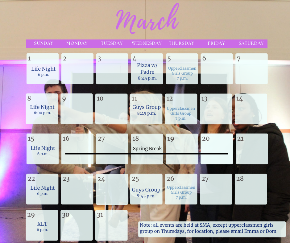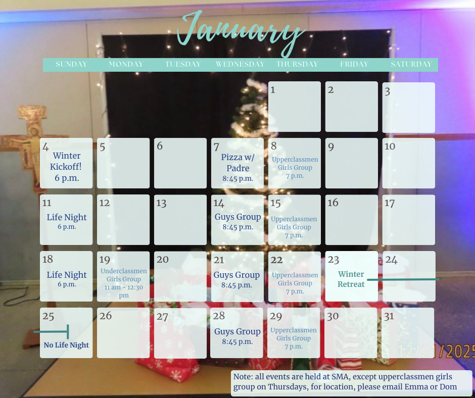 Welcome to Life Teen SMA! Our program runs through 7-12th grade, see EDGE for middle school. For our high schoolers, below is our monthly schedule. Please join us and if you have any questions email the youth ministers!