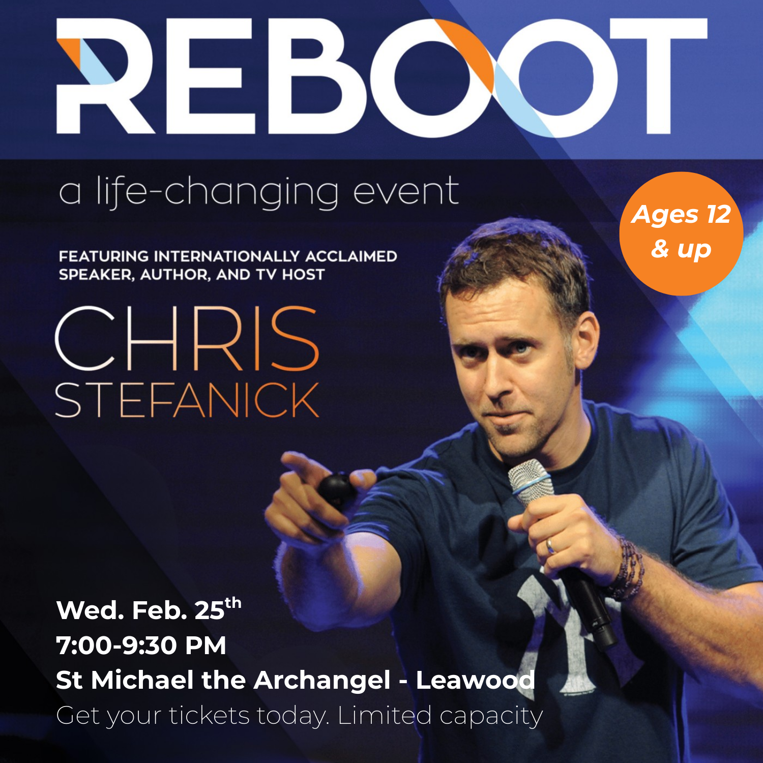 REBOOT! takes place from 7:00 – 9:30 PM on Wednesday, February 25th, 2026, and is led by Chris Stefanick.
