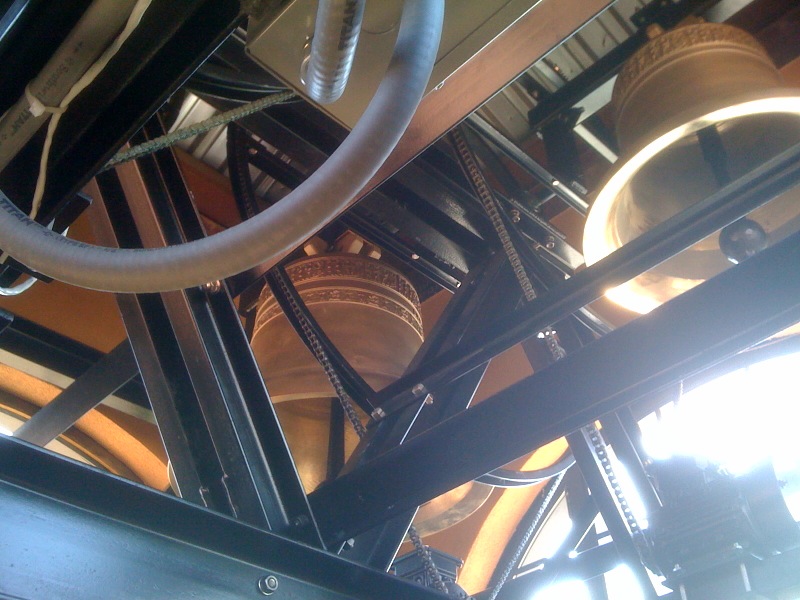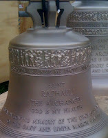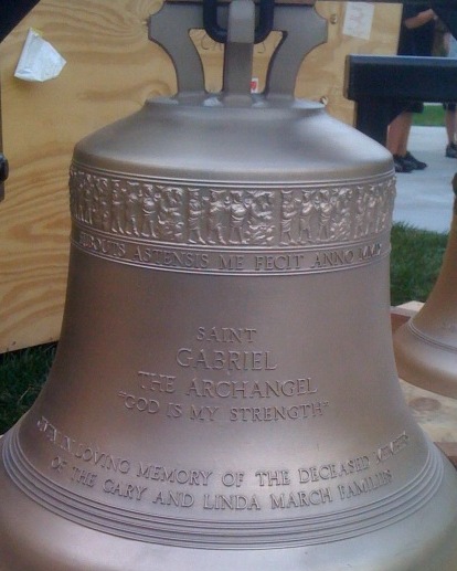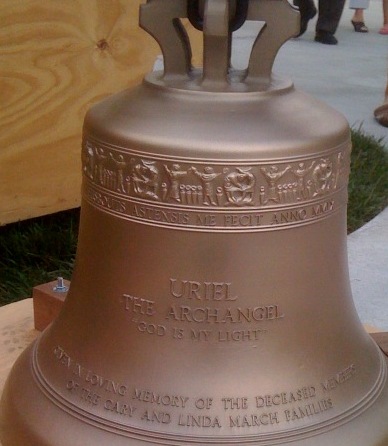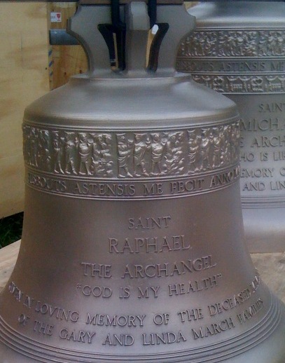 The bells ring the musical pitches of C, D, F and G, and are inscribed with the names of the archangels Michael (“Who is like God”), Gabriel (“God is my strength”), Raphael (“God is my health”), and Uriel (“God is my light”).